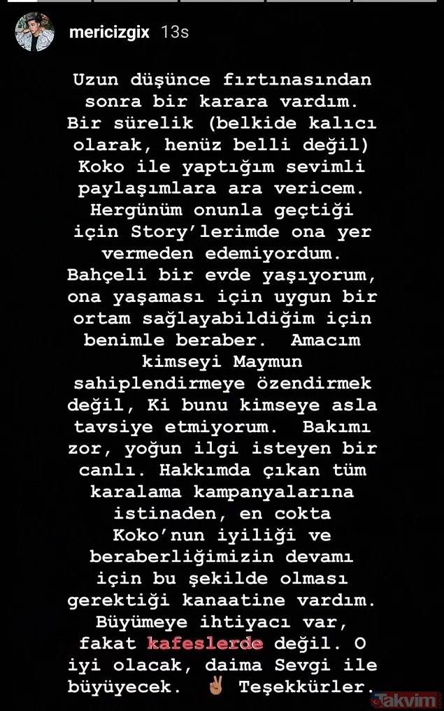 Maymun Koko ile yaptığı paylaşımlar sayesinde çok sayıda takipçi kazanan Meriç İzgi'nin evine bir süre önce baskın düzenlenmiş, kaçak yollarla ülkeye sokulan maymuna Doğa Koruma ve Milli Parklar Müdürlüğü el koymuştu. 8 bin TL ceza ödeyen sosyal medya ünlüsü durmadı. 5 ay sonra ikinciyi, o elinden alınınca 3.'yü aldı ve videolar paylaşmaya devam etti.