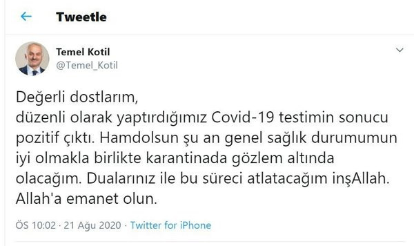 TUSAŞ Genel Müdürü ve THY eski Genel Müdürü Temel Kotil geçtiğimiz günlerde sosyal medyada hesabı üzerinden koronavirüs testinin pozitif çıktığını duyurmuştu. Kotil, bugün solunum yollarındaki sıkıntılardan dolayı yoğun bakıma alındı. Kotil'in herhangi bilinen kronik rahatsızlığı bulunmuyordu.