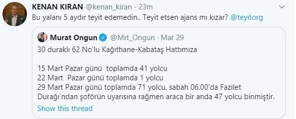 Teyit.org'dan taraflı tutumu, Sabah Gazetesi yazarı Kenan Kıran'ın da gündemindeydi. İBB Sözcüsü Murat Ongun'un Fazilet Durağı yalanına dikkat çeken Kıran, teyit.org'a "Bu yalanı 5 aydır teyit edemedin.. Teyit etsen ajans mı kızar?" sözleriyle tepki gösterdi.