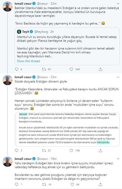 Cumhurbaşkanı Danışmanı İsmail Cesur, Twitter hesabından söz konusu habere tepki gösterdi. Cesur, paylşaımında "Baktılar İstanbul'daki su meselesini Erdoğan'a ve ondan sonra gelen belediye yönetimlerine ihale edemeyecekler, konuyu İstanbul'un kuruluşuna dayandırmaya karar vermişler. "İkinci Basileios da hiçbir şey yapmamış ki kardeşim bu şehre..." ifadelerine yer verdi.