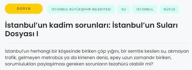Söz konusu dosya haberde "İstanbul'un su sorunu, 1990'lı yıllarda durmak bilmeyen göçle ayyuka çıkmıştı. Su kesintileri sıklaştı ve suyun kalitesi salgın hastalıklara neden olacak kadar düştü. Belediye Başkanı Nurettin Sözen, yağmur bombası olarak da bilinen suni yağış tekniği kullanmayı bile denedi. 1994 yerel seçimlerinde İstanbul Belediye Başkanı olarak seçilen Recep Tayyip Erdoğan, mevcut su sorununu çözmek için Istrancalar, Kazandere ve Pabuçdere Barajları'nı kurdurdu. Ancak sorun çözülmedi." şeklindeki ifadelerle CHP başarısızlığı kısa bir bölümde geçiştirilerek, Erdoğan'ın icraatlarının İstanbul'daki su sorununu çözemediği iddia edildi.