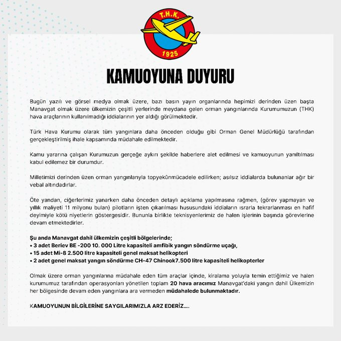 "Milletimizi derinden üzen orman yangınlarıyla topyekün mücadele edilirken, asılsız iddialarda bulunanlar ağır vebal altındadır. Öte yandan, ciğerlerimiz yanarken daha önceden detaylı açıklama yapılmasına rağmen, (görev yapmayan ve yıllık maliyeti 11 milyonu bulan) pilotların işten çıkarılması hususundaki iddiaların ısrarla tekrarlanması en hafif deyimiyle kötü niyetlerin göstergesidir. Bununla birlikte teknisyenlerimiz de halen görevlerine devam etmektedir. Şu anda Manavgat dahil ülkemizin çeşitli bölgelerinde, 3 adet Beriev BE -200 10 bin litre kapasiteli amfibik yangın söndürme uçağı, 15 adet Mi-8 2 bin 500 litre kapasiteli genel maksat helikopteri, 2 adet genel maksat yangın söndürme CH-47 Chinook 7 bin 500 litre kapasiteli helikopterler, olmak üzere orman yangınlarına müdahale eden tüm araçlar içinde, kiralama yoluyla temin ettiğimiz ve halen kurumumuzca operasyonları yönetilen toplam 20 hava aracımız Manavgat'taki yangın dahil ülkemizin her bölgesinde devam eden yangınlara ara vermeden müdahalede bulunmaktadır."