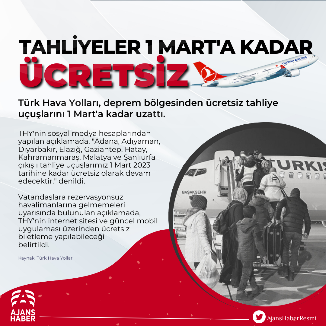 THY, afet bölgesindeki 11 ili kapsayan ücretsiz uçuşlarını 1 Mart 2023'e kadar uzatma kararı aldı.