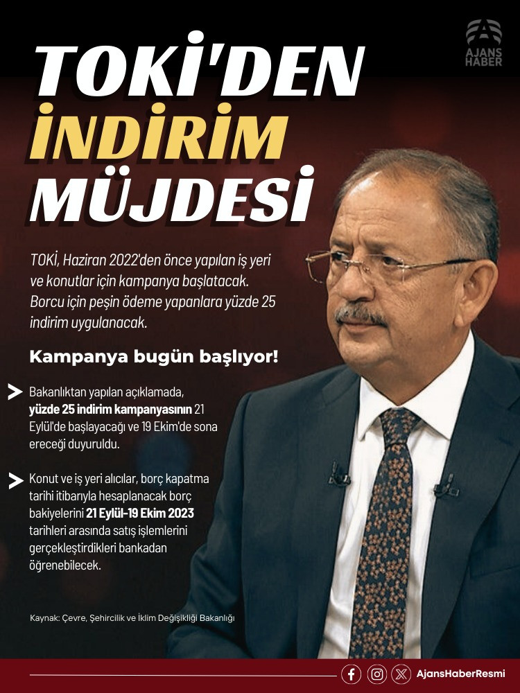 Çevre, Şehircilik ve İklim Değişikliği Bakanı Mehmet Özhaseki’nin, geçtiğimiz günlerde müjdesini verdiği Toplu Konut İdaresi (TOKİ)’den konut ve iş yeri alanlar için düzenlenen indirim kampanyası bugün başladı. Borcunu peşin ödemek isteyenler yüzde 25 indirimden faydalanacak.