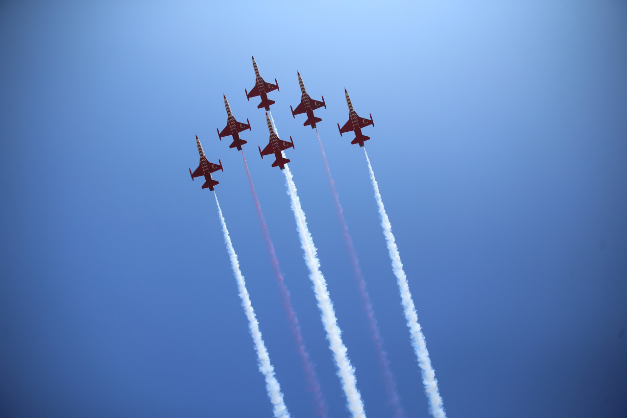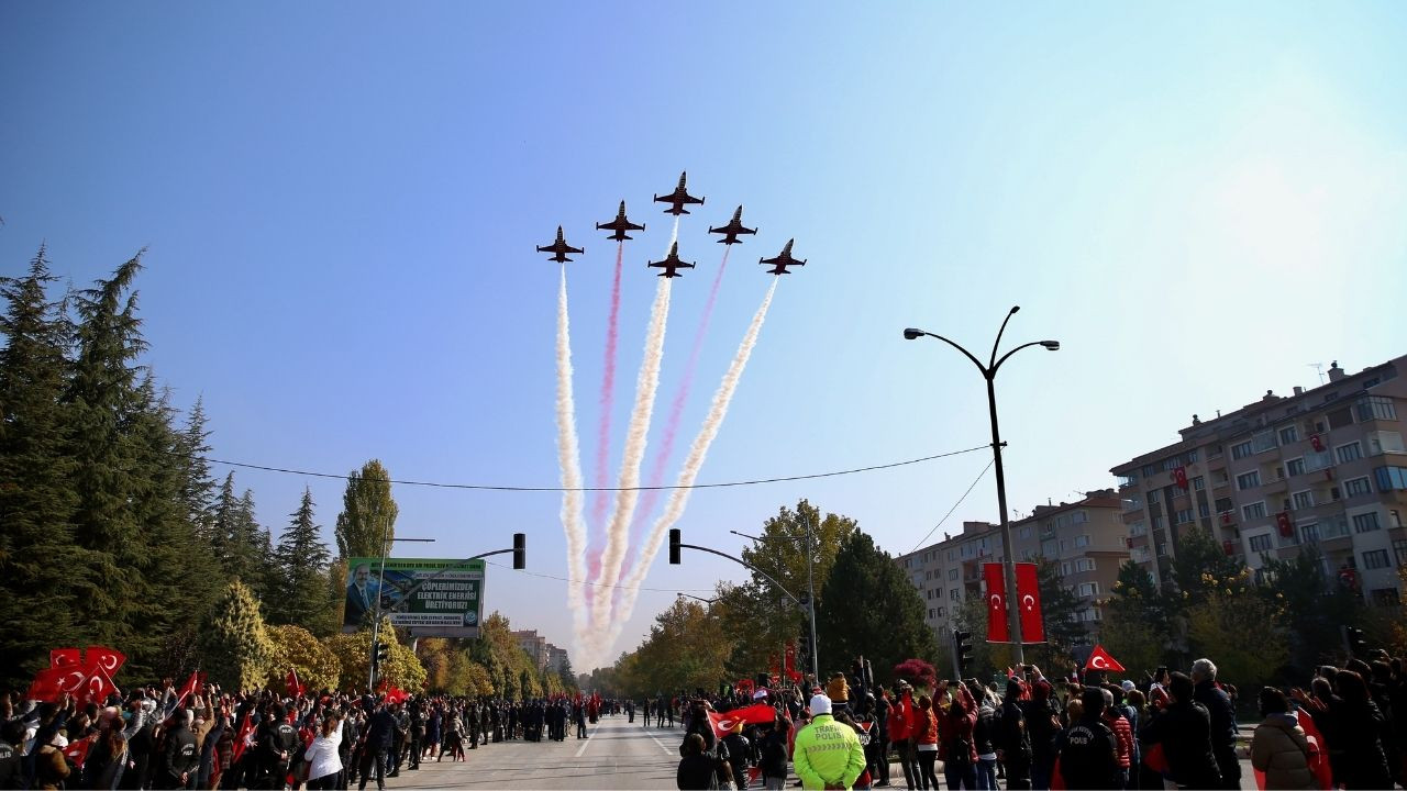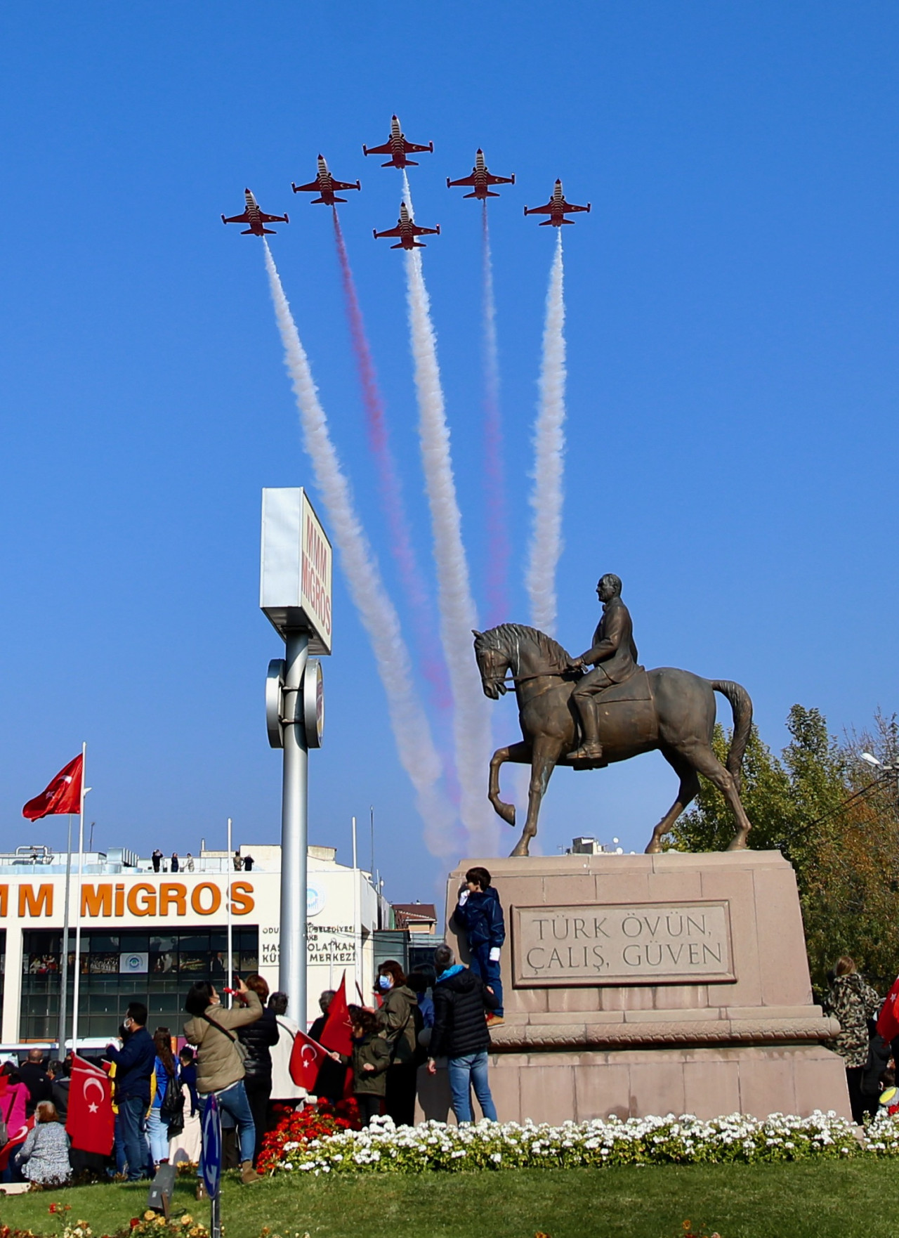 Eskişehir'de düzenlenen 29 Ekim Cumhuriyet Bayramı töreni kapsamında Eskişehir 1. Ana Jet Üs Komutanlığından kalkan Türk Yıldızları Akrobasi Timi selamlama uçuşu yaptı.