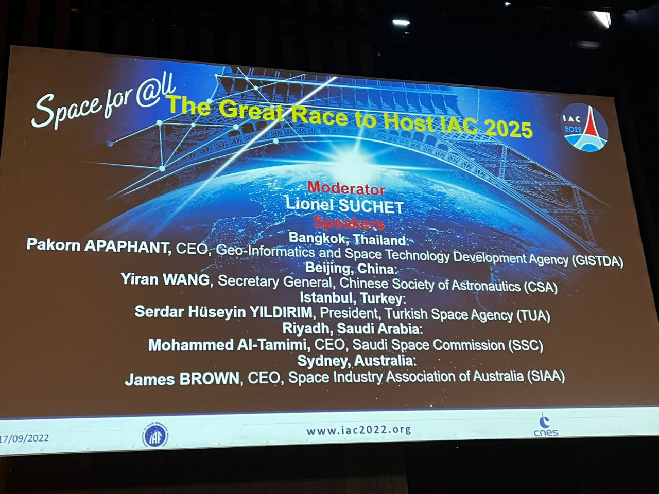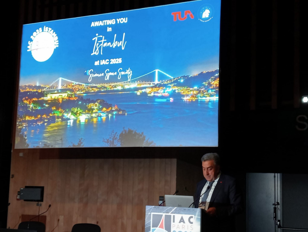 IAC 2022 Paris kapsamında düzenlenen Parlamento Üyeleri oturumunda Sanayi ve Teknoloji Bakanlığı Yardımcısı Mehmet Fatih KACIR bir konuşma gerçekleştirirken, TUA Başkanı Serdar Hüseyin YILDIRIM da İstanbul'un adaylığı konusunda bir sunum gerçekleştirdi.