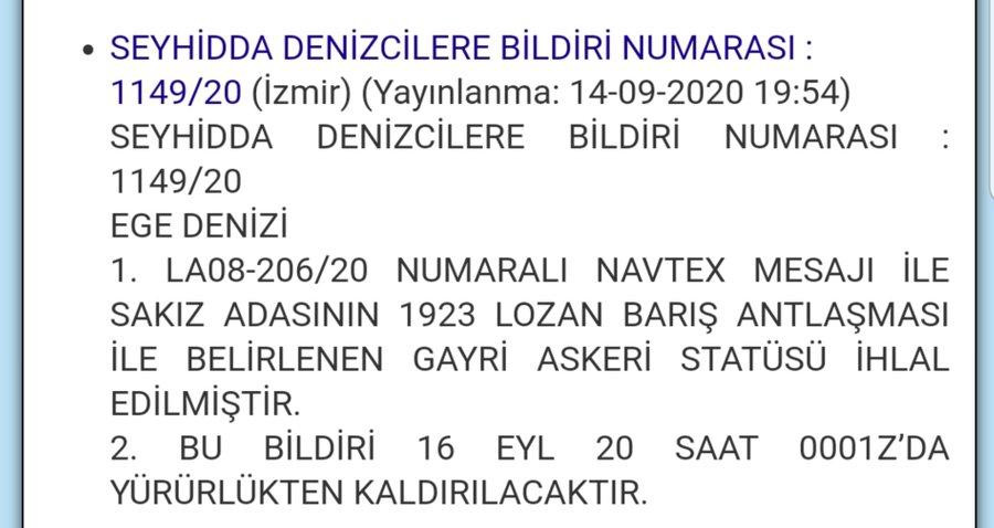 Türkiye, İzmir istasyonundan yayınladığı NAVTEX'te 1923 Lozan Antlaşması çerçevesinde Sakız Adası'nın gayri askeri statüsünün bozulduğunu ilan etti.