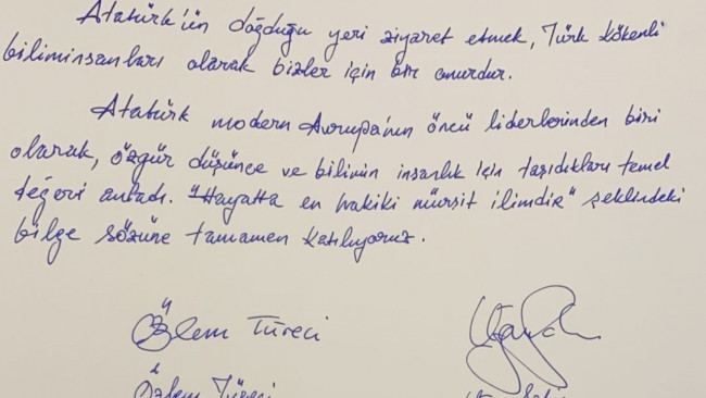 Havaalanında Türkiye’nin Atina Büyükelçisi Burak Özügergin’in karşıladığı Türeci ve Şahin çifti Atatürk Evi’ndeki anı defterine ise, "Atatürk’ün doğduğu yeri ziyaret etmek Türk kökenli bilim insanları olarak bizler için bir onurdur. Atatürk modern Avrupa’nın öncü liderlerinden biri olarak özgür düşünce ve bilimin insanlık için taşıdıkları temel değeri anladı. ’Hayatta en hakiki mürşit ilimdir’ şeklindeki bilge sözüne tamamen katılıyoruz" notunu yazdı.