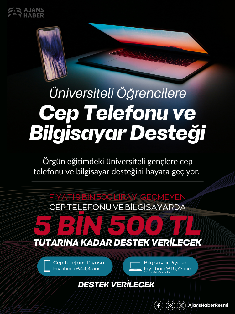 "Cuma günü TEKNOFEST 2023'te, bu sefer İzmir'de gençlerimizle gönül birlikteliğimizi yenileyeceğiz. "Üniversiteli gençlerimize vaadimiz olan cep telefonu ve bilgisayar desteğini hayata geçiriyoruz. Üniversiteli gençlerimize piyasa satış fiyatı 9 bin 500 lirayı geçmeyen cep telefonu ve bilgisayarlar için toplamda 5 bin 500 liraya kadar teknolojik cihaz desteği vereceğiz. Bu destekle cep telefonu için piyasa fiyatının yüzde 44,4'üne, bilgisayarlar içinse piyasa fiyatının yüzde 16,7'sine kadar bir tutarda destek sağlayacağız.