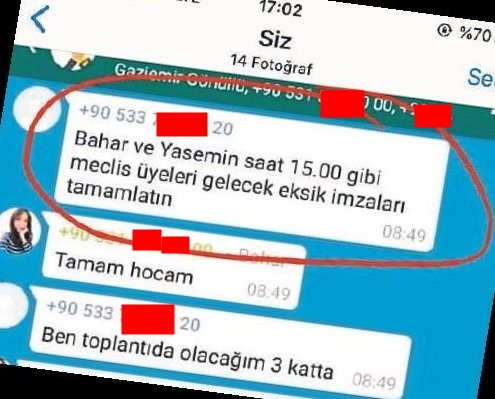 Gaziemir Belediyesi’nin CHP’li Başkanı Halil Arda’nın eşbaşkan gibi davranan eşi Deniz Arda’nın belediye personeline kurduğu “Bürgermeister- Team” (Başkanın Takımı) isimli whatsapp grubundan talimat yağdırdığı ortaya çıktı. Kendisine belediye logosuyla onursal koordinatör kartı bastıran Deniz Arda’nın mesajlarında personeli ihalelerle ilgili bile yönlendirdiği tespit edildi.