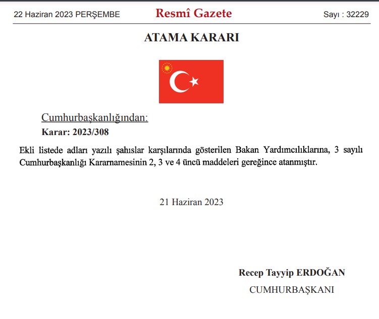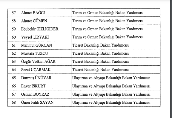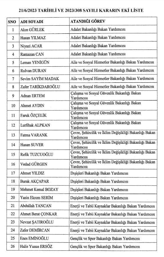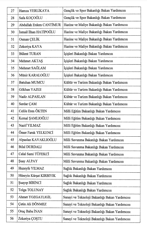 İşte yeni kabinenin bakanlarına yardımcı olarak Cumhurbaşkanlığı Kararnamesi ile atanan isimler: