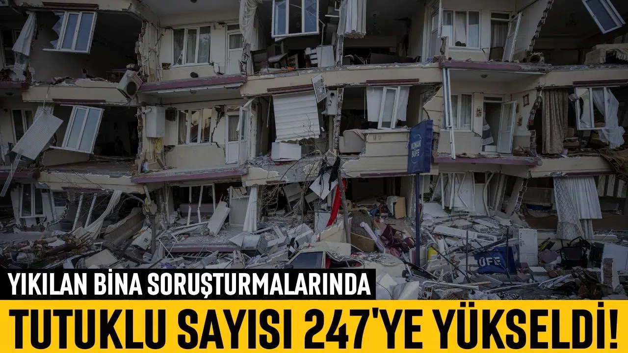 Soruşturmalar kapsamında bugüne kadar 93 müteahhit, 123 yapı sorumlusu, 13 yapı sahibi ve binalarda değişiklik yapan 18 şüpheli tutuklandıKahramanmaraş merkezli depremlerde yıkılan ya da imara aykırı değişiklik tespit edilen binalarla ilgili soruşturmalarda 93'ü müteahhit, 123'ü yapı sorumlusu, 13'ü yapı sahibi ve 18'i binada değişiklik yapan olmak üzere 247 şüpheli tutuklandı.