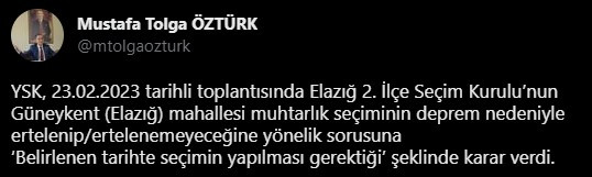 YSK’nın bu kararını sosyal medya hesabından paylaşan İYİ Parti’nin YSK temsilcisi Mustafa Tolga Öztürk; 23 Şubat 2023 tarihinde yapılan toplantıda “Elazığ 2. İlçe Seçim Kurulu’nun Güneykent mahallesi muhtarlık seçiminin deprem nedeniyle ertelenip ertelenemeyeceğine yönelik sorusuna ‘belirlenen tarihte seçimin yapılması gerektiği’ şeklinde karar verdiğini” açıkladı. Öztürk, bunun aynı zamanda bir emsal karar olduğunu da ifade etti.