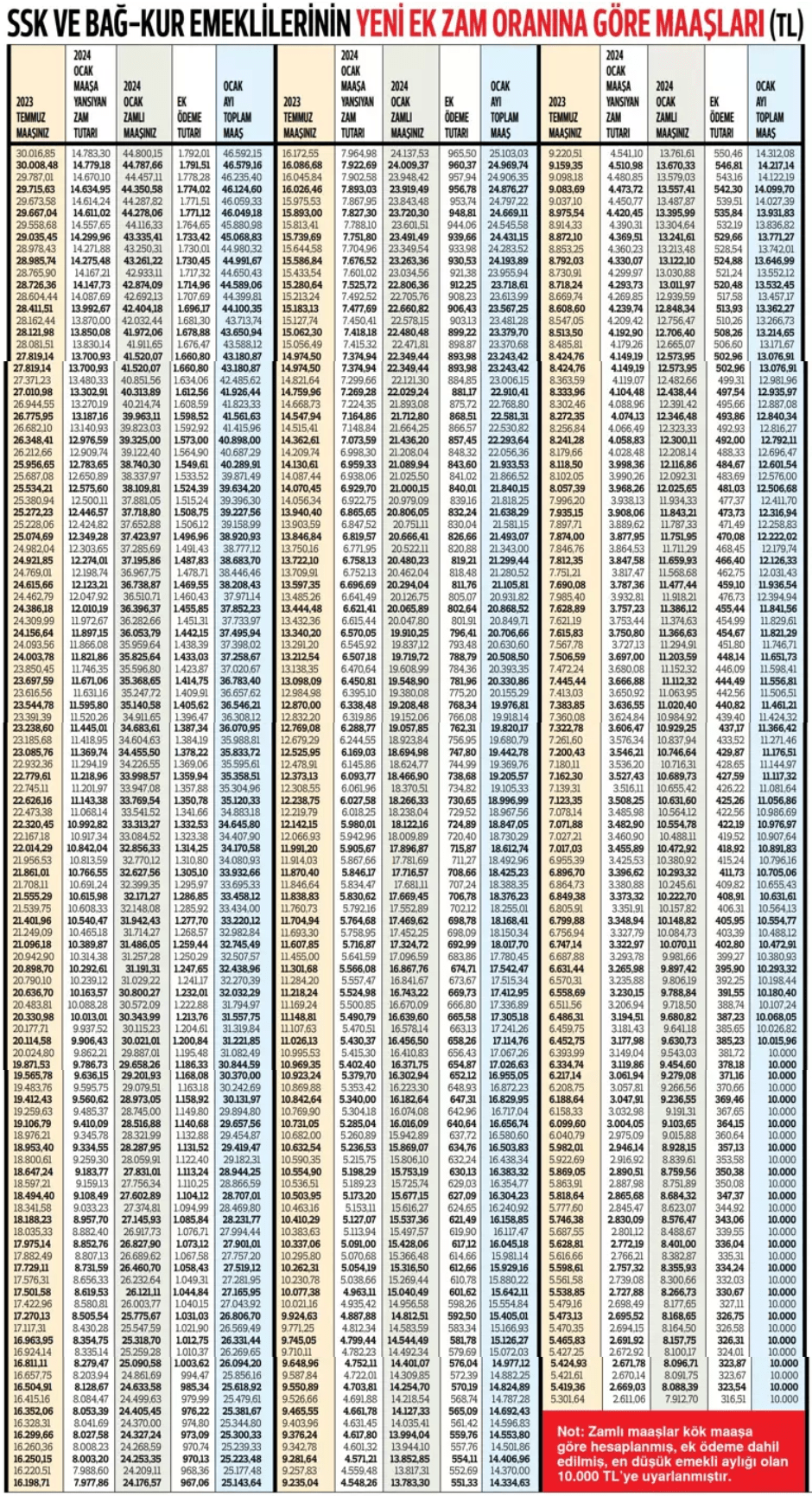 SSK ve Bağ-Kur ve emeklileri 2024 Ocak ayından itibaren maaşlarını yüzde 49.25 zamlı alacak. En düşük emekli aylığı da yine ocak ayından itibaren 10 bin lira olacak.