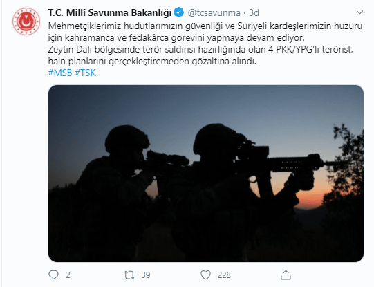 MSB açıklamasında, "Mehmetçiklerimiz hudutlarımızın güvenliği ve Suriyeli kardeşlerimizin huzuru için kahramanca ve fedakârca görevini yapmaya devam ediyor. Zeytin Dalı bölgesinde terör saldırısı hazırlığında olan 4 PKK/YPG'li terörist, hain planlarını gerçekleştiremeden gözaltına alındı" denildi.