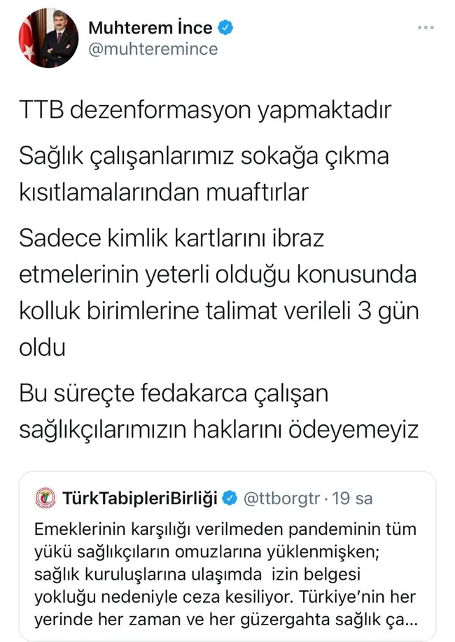 İnce; "Türk Tabipler Birliği dezenformasyon yapmaktadır. Sağlık çalışanlarımız sokağa çıkma kısıtlamalarından muaftırlar. Sadece kimlik kartlarını ibraz etmelerinin yeterli olduğu konusunda kolluk birimlerine talimat verileli 3 gün oldu. Bu süreçte fedakarca çalışan sağlıkçılarımızın haklarını ödeyemeyiz" ifadelerini kullandı.