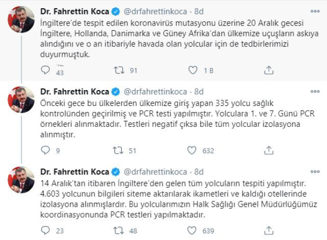 14 Aralık'tan itibaren İngiltere'den gelen tüm yolcuların tespiti yapılmıştır. 4.603 yolcunun bilgileri siteme aktarılarak ikametleri ve kaldığı otellerinde izolasyona alınmışlardır. Bu yolcularımızın Halk Sağlığı Genel Müdürlüğümüz koordinasyonunda PCR testleri yapılmaktadır"
