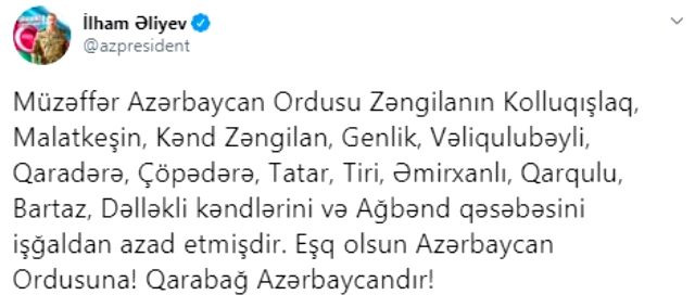 Aliyev ayrıca, Zengilan'ın Kolluk kışlak, Malatkeşin, Kend Zengilan, Genlik, Veligulubeyli, Garadere, Çöpedere, Tatar, Tiri, Amirhanlı, Gargulu, Bartaz, Dellekli köylerinin de işgalden kurtarıldığını ifade etti.