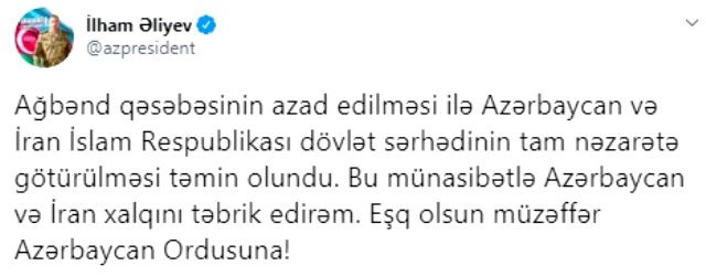 Öte yandan, Ağbend kasabasının kurtarılmasıyla Karabağ'ın İran sınırı tamamıyla Azerbaycan'ın kontrolüne geçti.