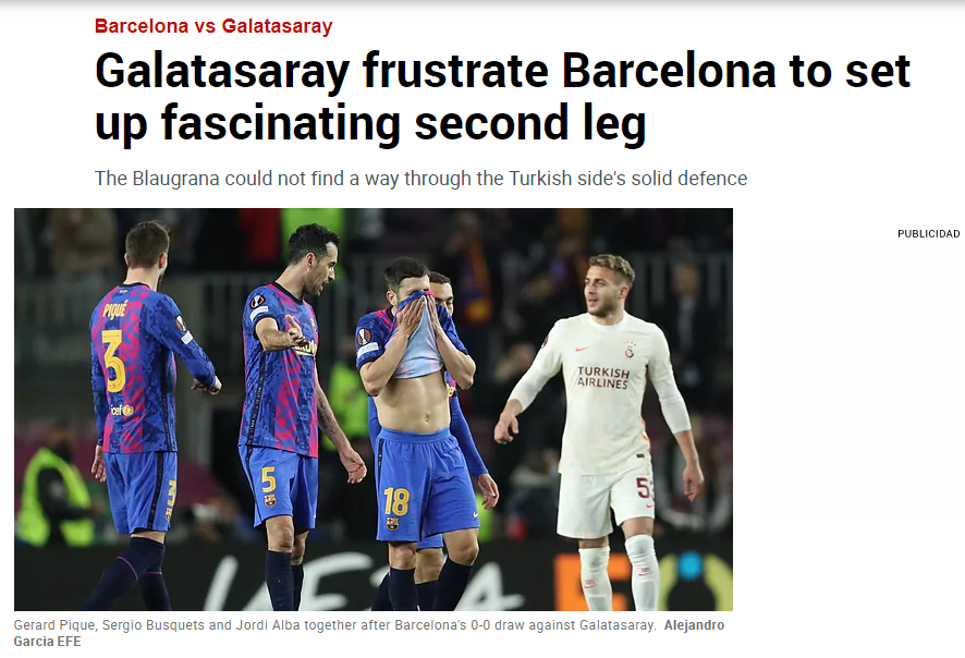 "Barcelona, oyunda üstündü ancak Galatasaray savunmasına ve Inaki Pena'ya takıldı. Barcelona'nın bu kadar zorlanacağını kimse tahmin etmemişti. Galatasaray direndi ve zaman zaman da kontrataklarla gole yaklaştı. Galatasaray, Inaki Pena ve de Jong'un şutunu püskürten direk sayesinde paçayı kurtardı. Barcelona kontrolü ele geçirmekte zorlandı. Bu rotasyondan ya da Galatasaray'ın savunmadaki çabasından dolayı olabilir. İkinci yarıda Barça şiddetini artırsa da Türk duvarına çarptı. Inaki Pena harika bir performans gösterdi.Xavi, maç içerisinde her şeyi denese de Galatasaray savunmasını aşamadı. Barça için şimdi tur tehlikede. El Clasico'dan yalnızca 3 gün öncesinde İstanbul'da zorlu bir maça çıkacaklar."
