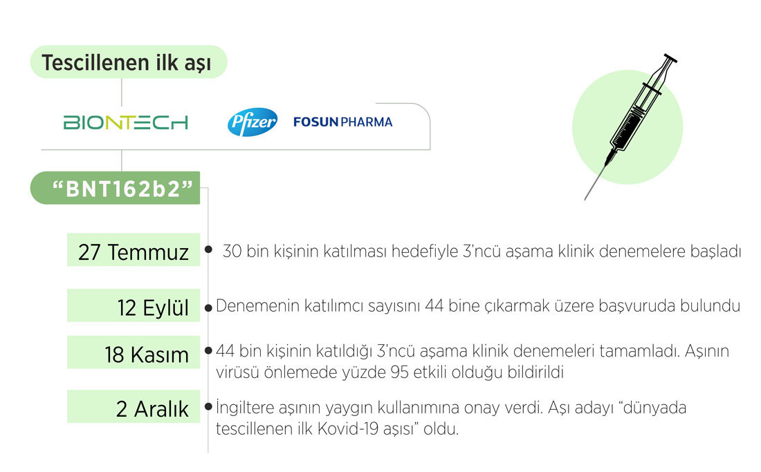 Almanya'da Türk bilim insanı Prof. Dr. Uğur Şahin'in kurucu ortağı olduğu biyoteknoloji firması BioNTech'in Amerikan ilaç şirketi Pfizer iş birliğinde geliştirdiği "BNT162b2" adı verilen aşı adayı, İngiltere'nin yaygın kullanımına onay vermesiyle "dünyada tescillenen ilk Kovid-19 aşısı" oldu.