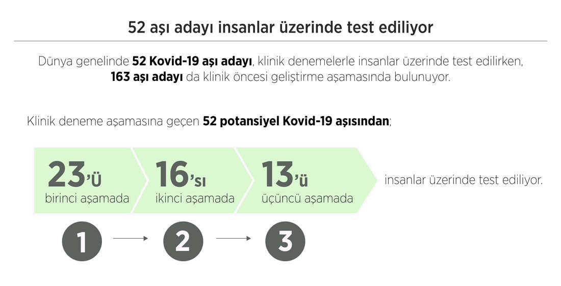Dünya Sağlık Örgütü (DSÖ) verilerine göre, 2 Aralık itibarıyla dünya genelinde 52 Kovid-19 aşı adayı, klinik denemelerle insanlar üzerinde test edilirken, 163 aşı adayı da klinik öncesi geliştirme aşamasında bulunuyor.