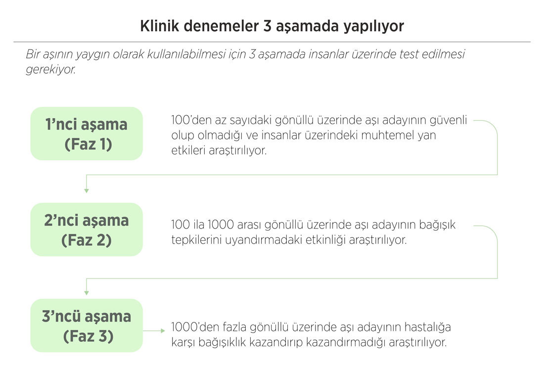 Bir aşının yaygın olarak kullanılabilmesi için 3 aşamada insanlar üzerinde test edilmesi gerekiyor. Klinik denemelerin ilk aşamasında, az sayıdaki gönüllü sağlıklı denek üzerinde aşının güvenli olup olmadığı ve insanlar üzerindeki muhtemel yan etkileri araştırılıyor. İkinci aşamada, aşının bağışık tepkilerini uyandırmadaki etkinliği 100’den fazla denek üzerinde test ediliyor. Üçüncü ve son aşamada ise aynı işlem, binlerce denekle tekrarlanıyor. Tüm bu süreç, aylar ve hatta yıllar alabiliyor.
