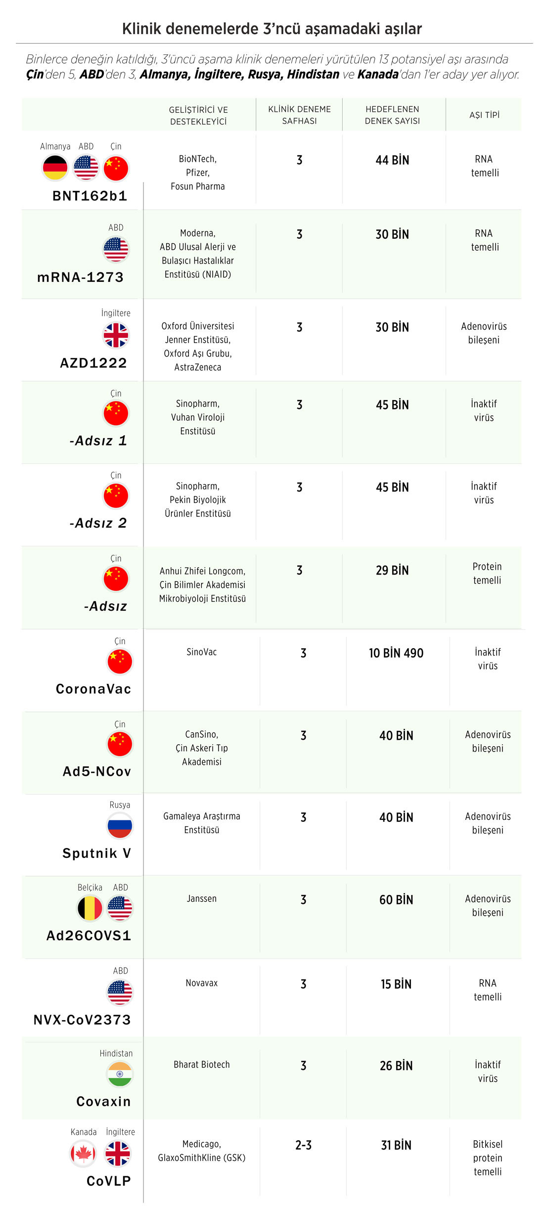 Binlerce deneğin katıldığı, 3'üncü aşama klinik denemeleri yürütülen 13 potansiyel aşı arasında Çin’den 5, ABD’den 3, Almanya, İngiltere, Rusya, Hindistan ve Kanada'dan birer aday yer alıyor.
