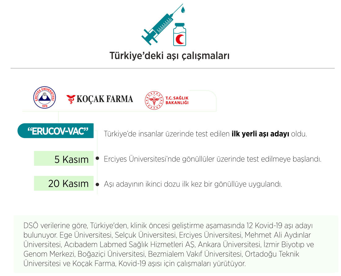 Erciyes Üniversitesi Aşı Araştırma ve Geliştirme Uygulama ve Araştırma Merkezinde (ERAGEM) yeni tip koronavirüse karşı geliştirilen, Koçak Farma şirketi tarafından üretimi yapılan ve Sağlık Bakanlığınca desteklenen "ERUCOV-VAC" adı verilen aşı adayı 5 Kasım'da gönüllüler üzerinde test edilmeye başlandı.