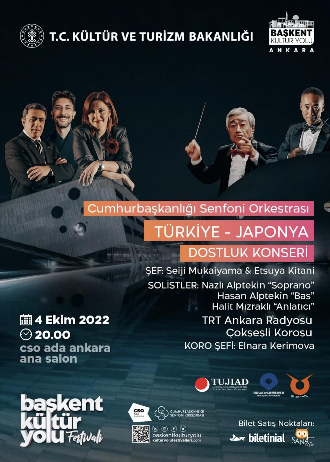 Türkiye Japonya Dostluk Konseri’nde şefler Seiji Mukaiyama-Etsuya Kitani ile baraber, solistler Nazlı Alptekin (Soprano), Hasan Alptekin (Bas), anlatıcı Halit Mızraklı ve Koro şefi Elnara Kerimova yönetiminde TRT Ankara Radyosu Çoksesli Korosu yer alacaklar.