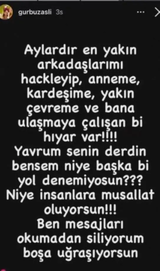"Aylardır en yakın arkadaşlarımı hackleyip, anneme, kardeşime, yakın çevreme ve bana ulaşmaya çalışan bir hıyar var! Yavrum senin derdin bensem niye başka bir yol denemiyorsun. Niye insanlara musallat oluyorsun! Ben mesajları okumadan siliyorum boşa uğraşıyorsun."