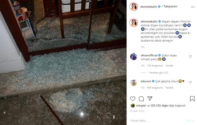Kızının üzerine düşen camın fotoğrafını paylaşan ünlü şarkıcı, "Akşam akşam Hira'nın üstüne düşen kış bahçesi camı! Bir ufak çizikle kurtulması bugün sevindirdiğim kız çocukları. Başka bir açıklaması yok! Allah korudu… Dualarınızı eksik etmeyin" dedi.