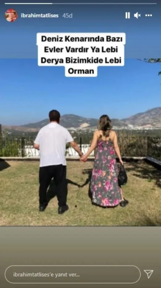 Instagram'da 1,5 milyon takipçisi bulunan İbrahim Tatlıses, hikaye kısmında sevgilisiyle el ele tutuştuğu bir kareyi yayınladı. Sanatçı paylaşımına da "Deniz kenarında bazı evler vardır ya lebi derya. Bizimki de lebi orman" notunu ekledi. Tatlıses ve sevgilisinin pozu kısa sürede sosyal medyada hızla yayıldı.