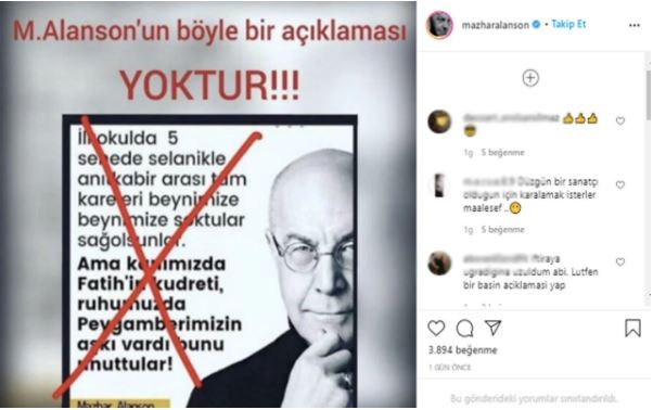 Beni linç ediyorlar: Röportajın devamında Alanson "Ben mesela, okullarda Atatürk sevgisini otomatikman pek çok çocuk gibi aldım bünyeye. Ama Peygamberime de aşığım, ne var bunda!’ demiştim. Röportajdan bakabilirsiniz ne dediğime. Beni linç ediyorlar” ifadelerini kullandı.