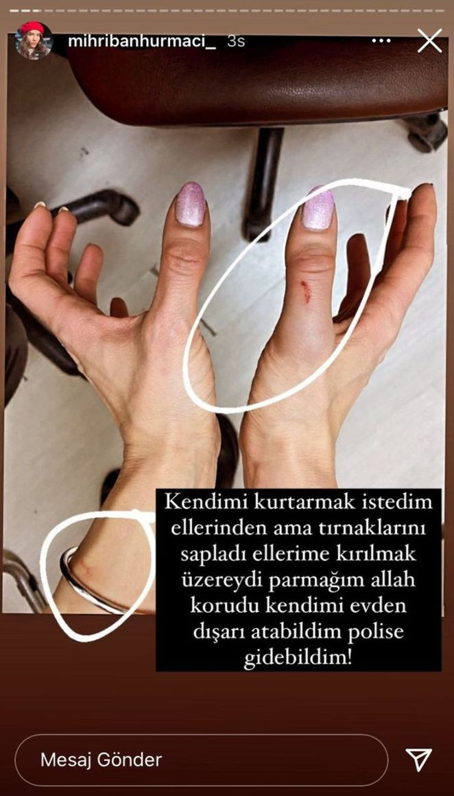 Bunun üzerine müvekkilim bu durumdan kurtulmaya çalışırken Mihriban Hurmacı'nın kaşında kanama olmuş ve o halde darp raporu almak üzere hastaneye gitmiştir. Yüzünün diğer bölgelerinde görülen kanlar da kaşındaki kanamadan kaynaklanmaktadır. Ayrıca Mihriban Hurmacı'nın müvekkilim Özer Hurmacı'nın parmağını ısırması neticesinde parmağına 3 (üç) dikiş atılmıştır.