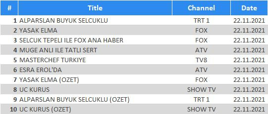 İşte 22 Kasım Pazartesi günü ekranlarda en çok izlenen 10 program;