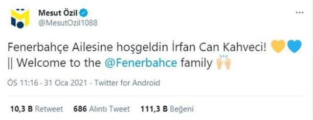 Mesut, Twitter hesabından yaptığı paylaşımda, "Fenerbahçe Ailesine hoş geldin İrfan Can Kahveci!" ifadesine yer verdi.