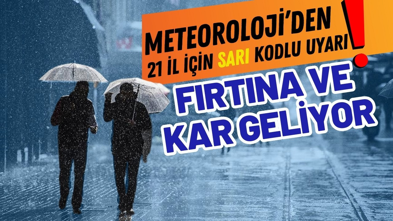 Meteoroloji Genel Müdürlüğü yeni hava durumu raporunu yayımladı. Karadeniz ile Doğu Anadolu'da fırtına ve kar yağışı beklenen 21 il için sarı kodlu uyarı yapıldı.