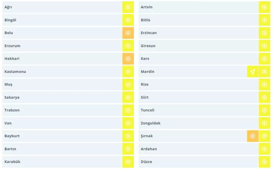 Yağışların, Giresun, Trabzon, Rize, Artvin'in kıyı kesimlerinde kuvvetli yağmur, iç kesimlerinde karla karışık yağmur ve yoğun kar şeklinde; Siirt, Şırnak ve Hakkari ile Van'ın güney çevrelerinde kuvvetli karla karışık yağmur ve yoğun kar şeklinde görülmesi beklendiğinden yaşanabilecek olumsuzluklara karşı (ulaşımda aksamalar, buzlanma ve don olayı vb.) dikkatli ve tedbirli olunması gerekmektedir.
