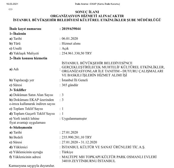 “İstanbul Büyükşehir Belediyesince Gerçekleştirilecek Muhtelif Organizasyonlar İle Tanıtım-Duyuru Çalışmaları Ve Baskılı İşlerin Hizmet Alımı İşi” başlığı ile 31 Aralık 2019 tarihinde yapılan ihaleyi 222 milyon 653 bin 507 TL bedelle tek katılımcı olan İBB iştiraki İstanbul Kültür Ve Sanat Ürünleri Tic. A.Ş. kazandı.