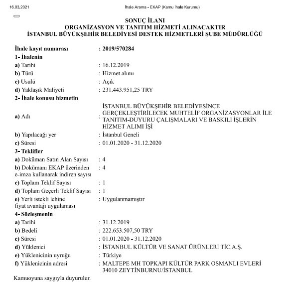 İstanbul Büyükşehir Belediyesince gerçekleştirilen 2019/570284 EKAP numarasıyla “Muhtelif Organizasyonlar İle Tanıtım-Duyuru Çalışmaları Ve Baskılı İşlerin Hizmet Alımı İşi” başlıklı ihalenin 222 milyon 653 bin 507 TL bedelle tek katılımcı olan İBB iştiraki İstanbul Kültür Ve Sanat Ürünleri Tic. A.Ş. kazandığı görülmektedir.