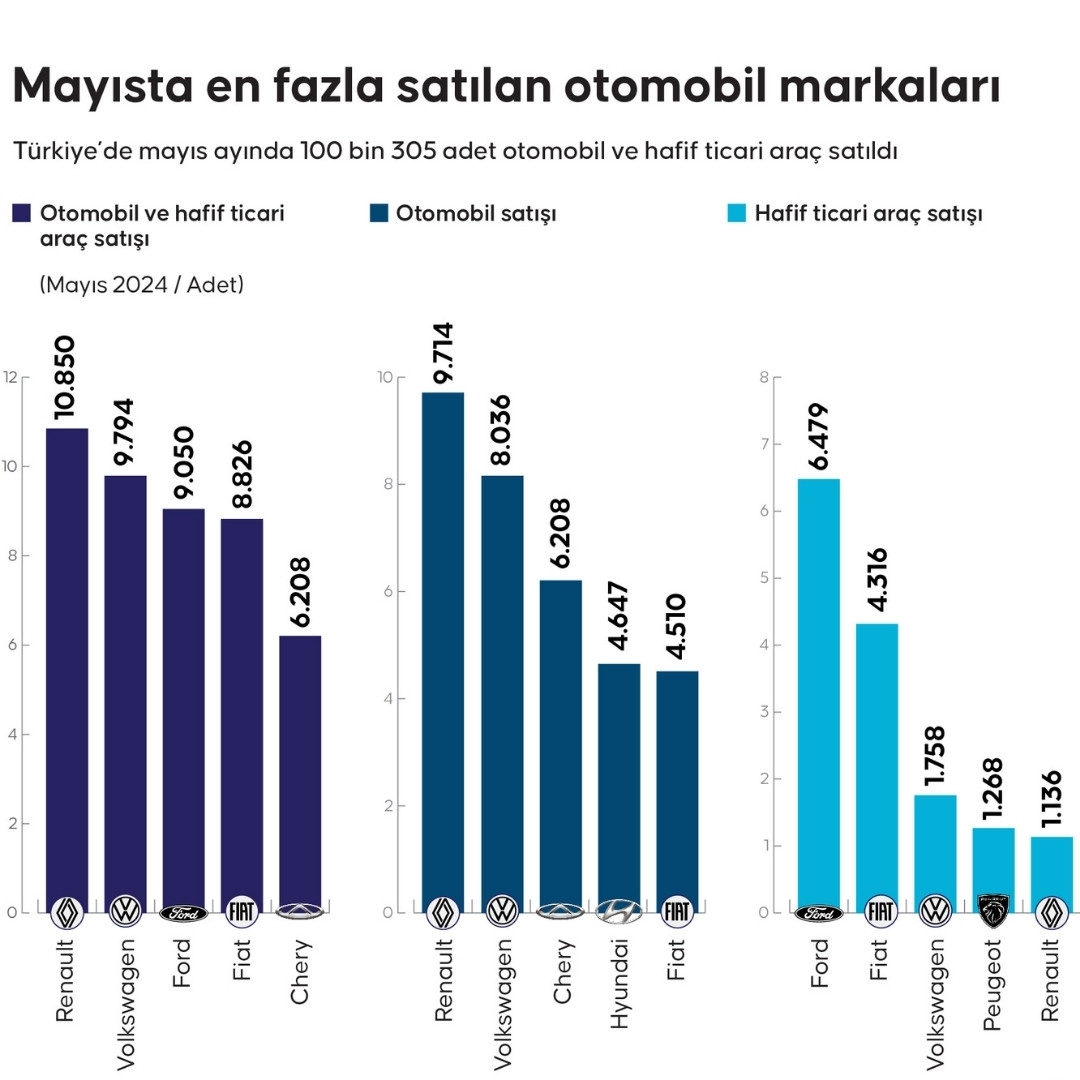Mayıs ayında binek ve hafif ticari olmak üzere toplam satışlarda 10 bin 850 adetle Renault ilk sırayı aldı. Onu 9 bin 794 satışla Volkswagen ve 9 bin 50 adetle Ford takip etti.