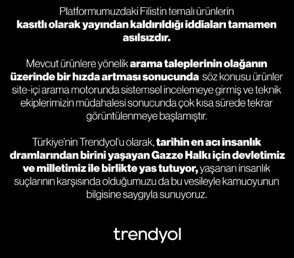 “Mevcut ürünlere yönelik arama taleplerinin olağanın üzerinde bir hızda artması sonucunda söz konusu ürünler site-içi arama motorunda sistemsel incelemeye girmiş ve teknik ekiplerimizin müdahalesi sonucunda çok kısa sürede tekrar görüntülenmeye başlamıştır. Türkiye’nin Trendyol’u olarak, tarihin en acı insanlık dramlarından birini yaşayan Gazze Halkı için devletimiz ve milletimiz ile birlikte yas tutuyor, yaşanan insanlık suçlarının karşısında olduğumuzu da bu vesileyle kamuoyunun bilgisine saygıyla sunuyoruz.”