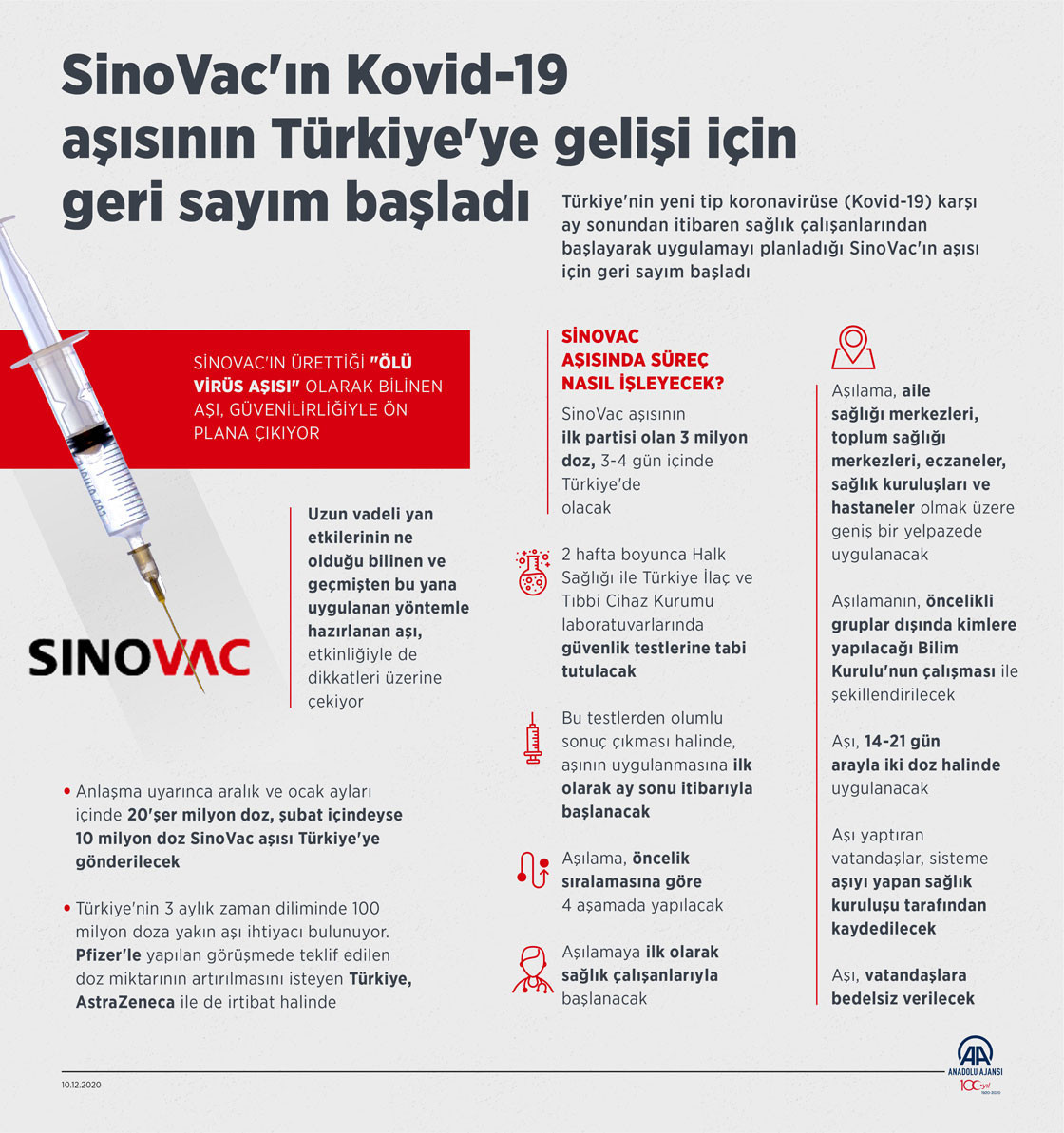 Türkiye'nin yeni tip koronavirüse (Kovid-19) karşı ay sonundan itibaren sağlık çalışanlarından başlayarak uygulamayı planladığı SinoVac'ın aşısı için geri sayım başladı.