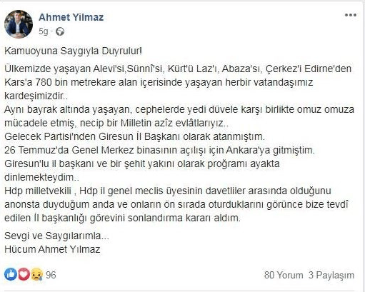 “26 Temmuz'da Genel Merkez binasının açılışı için Ankara'ya gitmiştim. Giresunlu il Başkanı ve bir şehit yakını olarak programı ayakta dinlemekteydim. HDP milletvekili, HDP il genel Meclis üyesinin davetliler arasında olduğunu anonsta duyduğum anda ve onların ön sırada oturduklarını görünce bize tevdi edilen il başkanlığı görevini sonlandırma kararı aldım.”