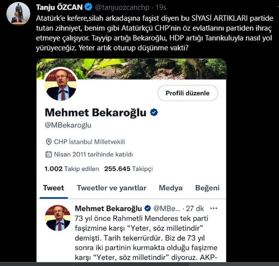 “Atatürk’e kefere, silah arkadaşına faşist diyen bu SİYASİ ARTIKLARI partide tutan zihniyet, benim gibi Atatürkçü CHP’nin öz evlatlarını partiden ihraç etmeye çalışıyor. Tayyip artığı Bekaroğlu, HDP artığı Tanrıkuluyla nasıl yol yürüyeceğiz. Yeter artık oturup düşünme vakti?”