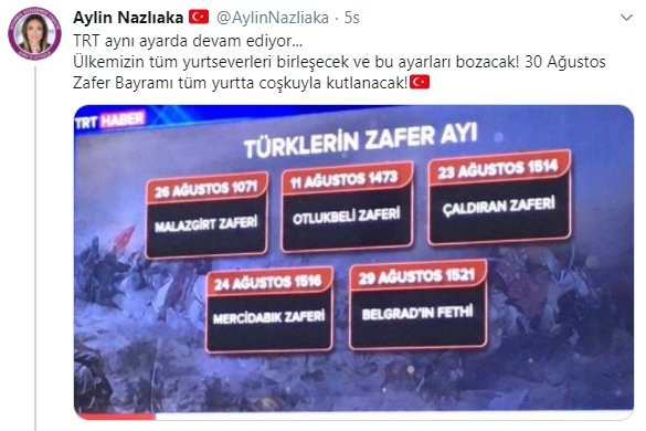 "Az önce TRT'den arayıp bir bilgi verdiler. Cumhuriyetin önemli kazanımlarından birisi olan TRT kurumu, yapması gereken kamu yayıncılığını neyse ki yapmış ve #30AğustosZaferBayramı'na özel bir program hazırlamış.