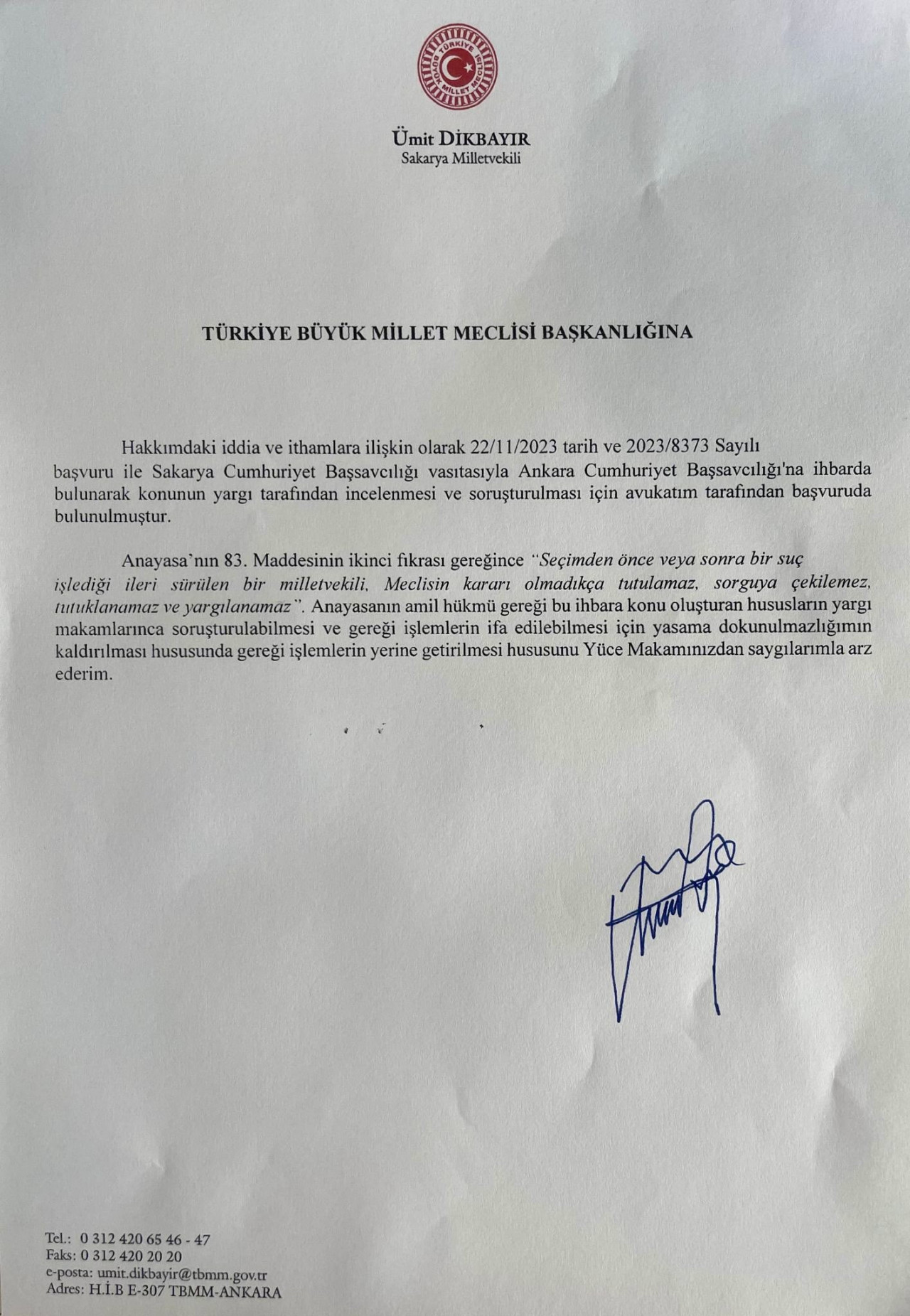 İYİ Parti Sakarya Milletvekili Ümit Dikbayır, hakkındaki iddiaların soruşturulması için savcılığa suç duyurusunda bulundu, TBMM Başkanlığından dokunulmazlığının kaldırılmasını talep etti.