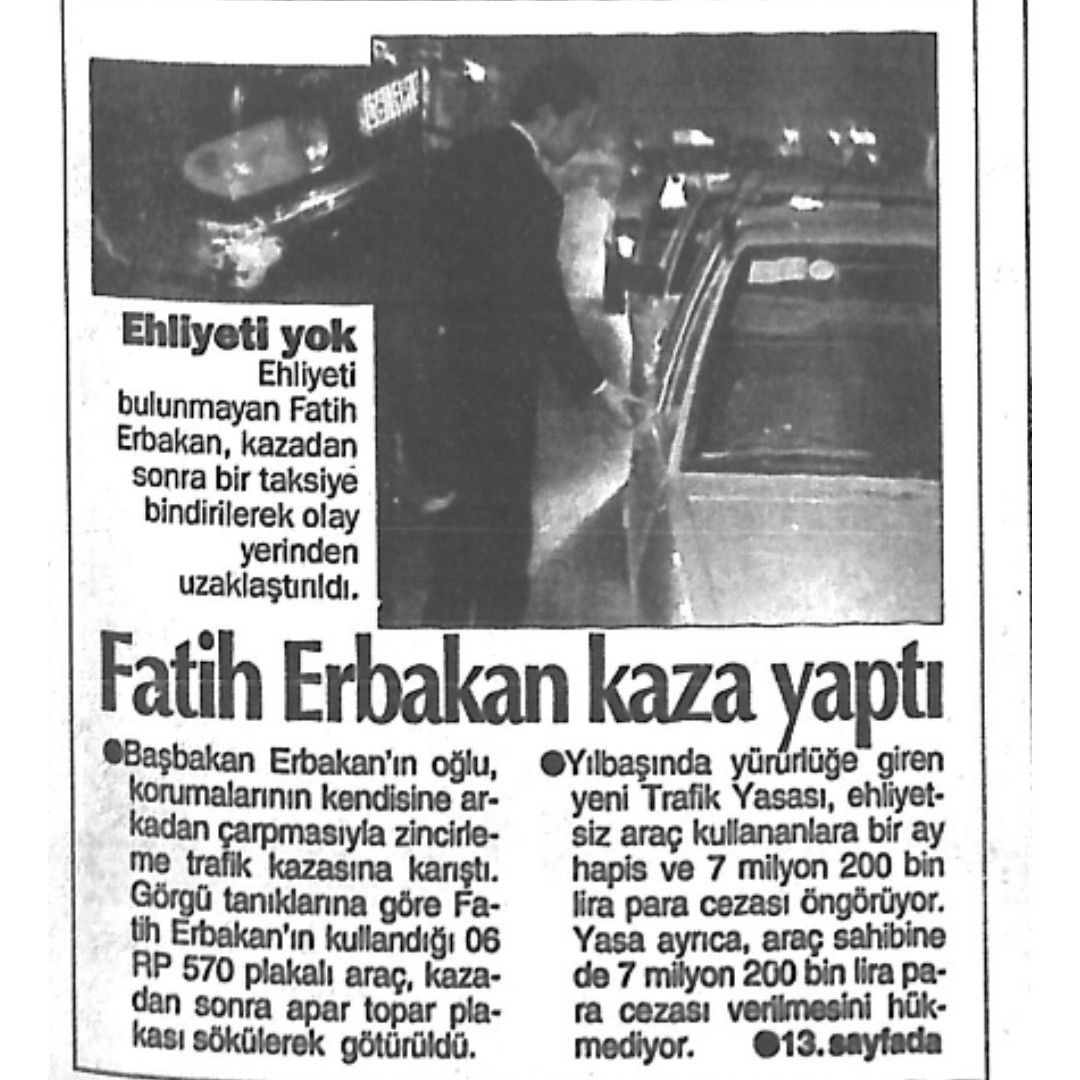 Fatih Erbakan, babası Necmettin Erbakan’ın Başbakan olduğu 1997 yılında 06RP570 plakalı lüks aracıyla Ankara Esat Caddesi üzerinde ehliyetsiz şekilde kazaya karışmasıyla o dönemin gazetelerinde haber olmaya başlıyor. Koruma polisleri olay yerinde gerçeğe aykırı bir tutanak tutarak olayın üzerini kapatıyor ve sonrasında şu olaylar yaşanıyor: