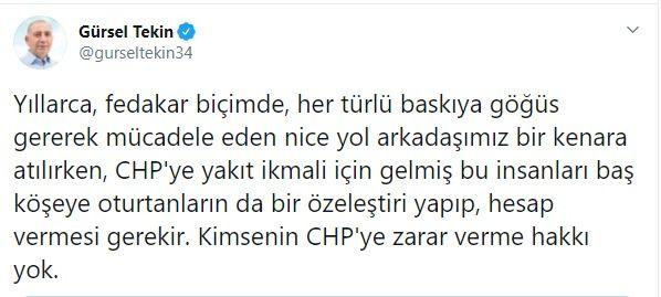 Tekin, sosyal medya hesabı Twitter üzerinden yönetimi eleştirerek, "Yıllarca, fedakar biçimde, her türlü baskıya göğüs gererek mücadele eden nice yol arkadaşımız bir kenara atılırken CHP'ye yakıt ikmali için gelmiş bu insanları baş köşeye oturtanların da bir özeleştiri yapıp hesap vermesi gerekir. Kimsenin CHP'ye zarar verme hakkı yok" sözleri dikkat çekti.